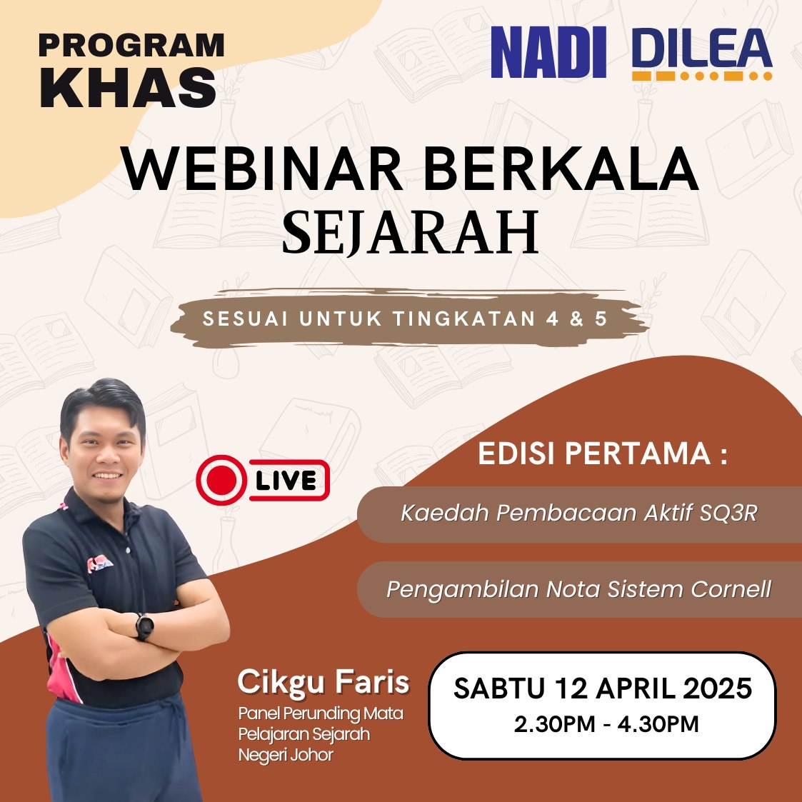 Sukacita dimaklumkan di bawah Elemen Program Khas NADI-Nurture DILEA, Webinar Berkala Sejarah Edisi Pertama akan diadakan dan terbuka kepada pelajar Tingkatan 4 dan 5. Webinar ini akan diadakan pada 12 April 2025.