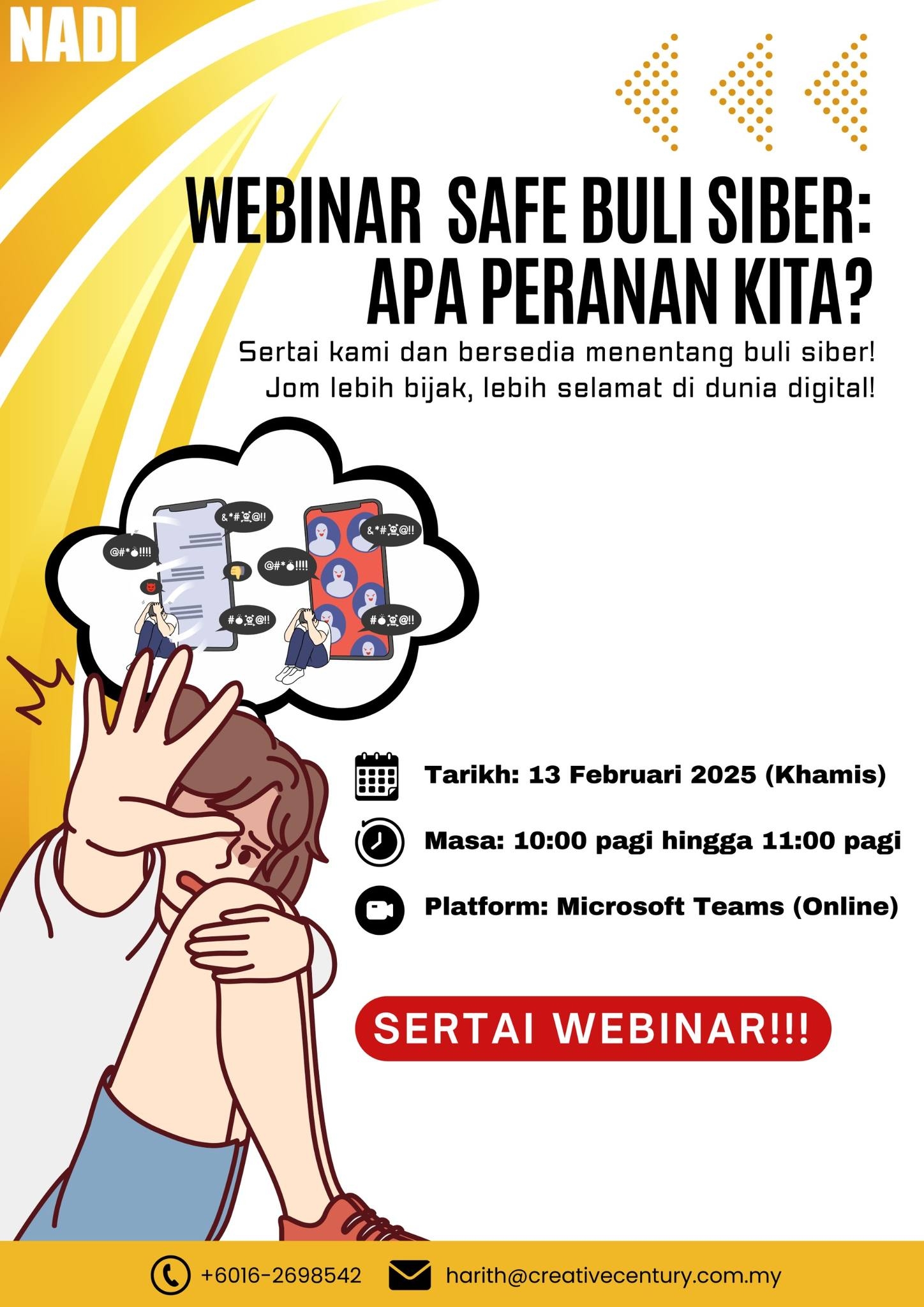 📢 Dengan segala hormatnya, pihak kami ingin menjemput anda untuk menyertai Webinar SAFE Buli Siber: Apa Peranan Kita 🛡💻, sebuah inisiatif untuk memperkasa komuniti dengan meningkatkan kesedaran, memberi pengetahuan tentang buli siber, serta membina amalan keselamatan di alam maya. 🌍🔒