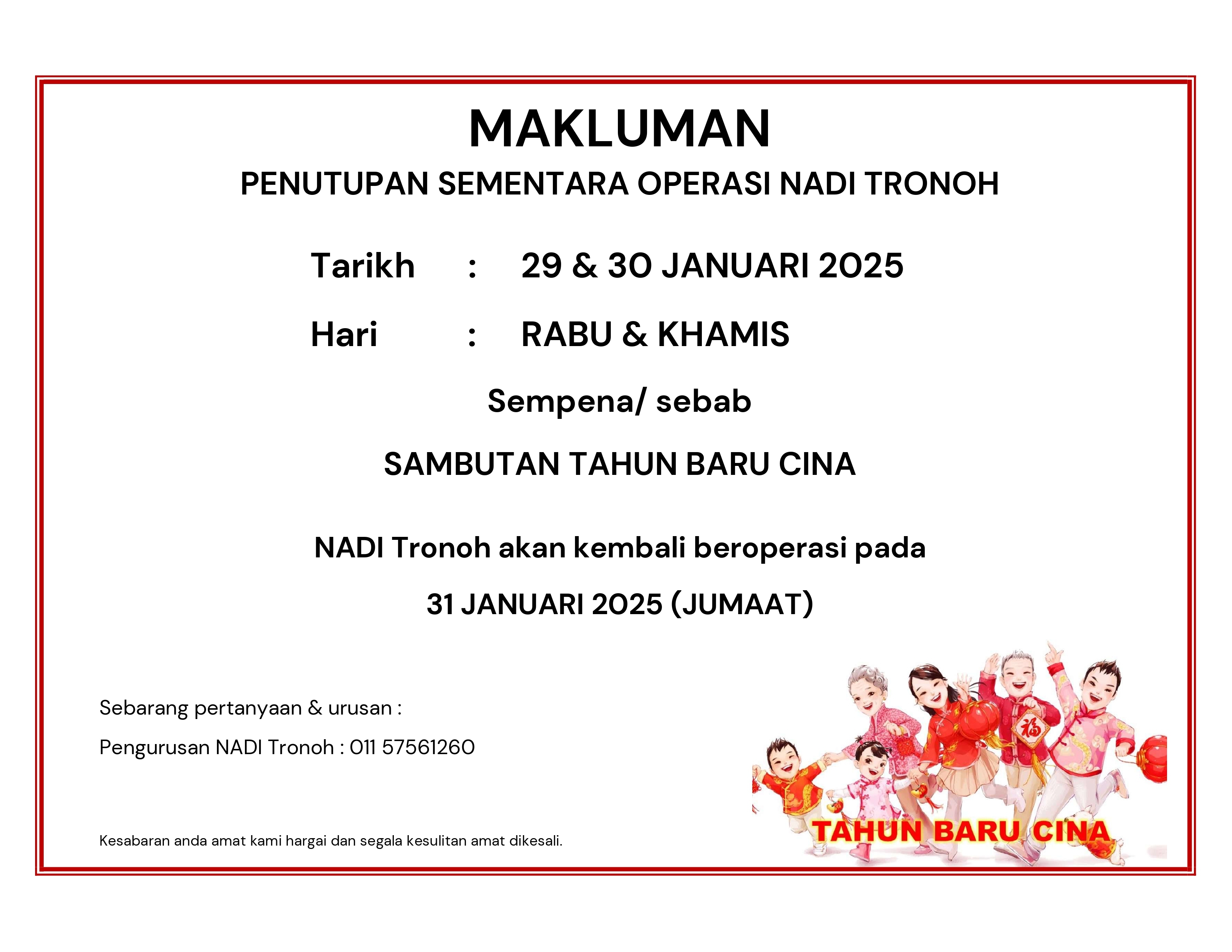 Dimaklumkan bahawa operasi NADI Tronoh akan ditutup sementara bersempena sambutan Tahun Baru Cina pada 29 & 30 Januari 2025 (Rabu & Khamis).