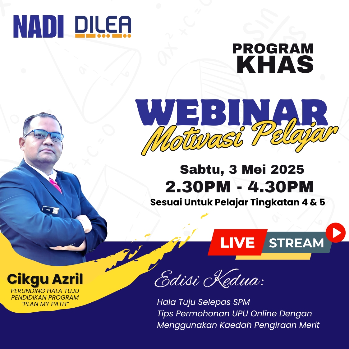 Sukacita dimaklumkan di bawah Elemen Program Khas NADI-Nurture DILEA, *Webinar Motivasi Pelajar Edisi Kedua* akan diadakan dan terbuka kepada pelajar Tingkatan 4 dan 5.