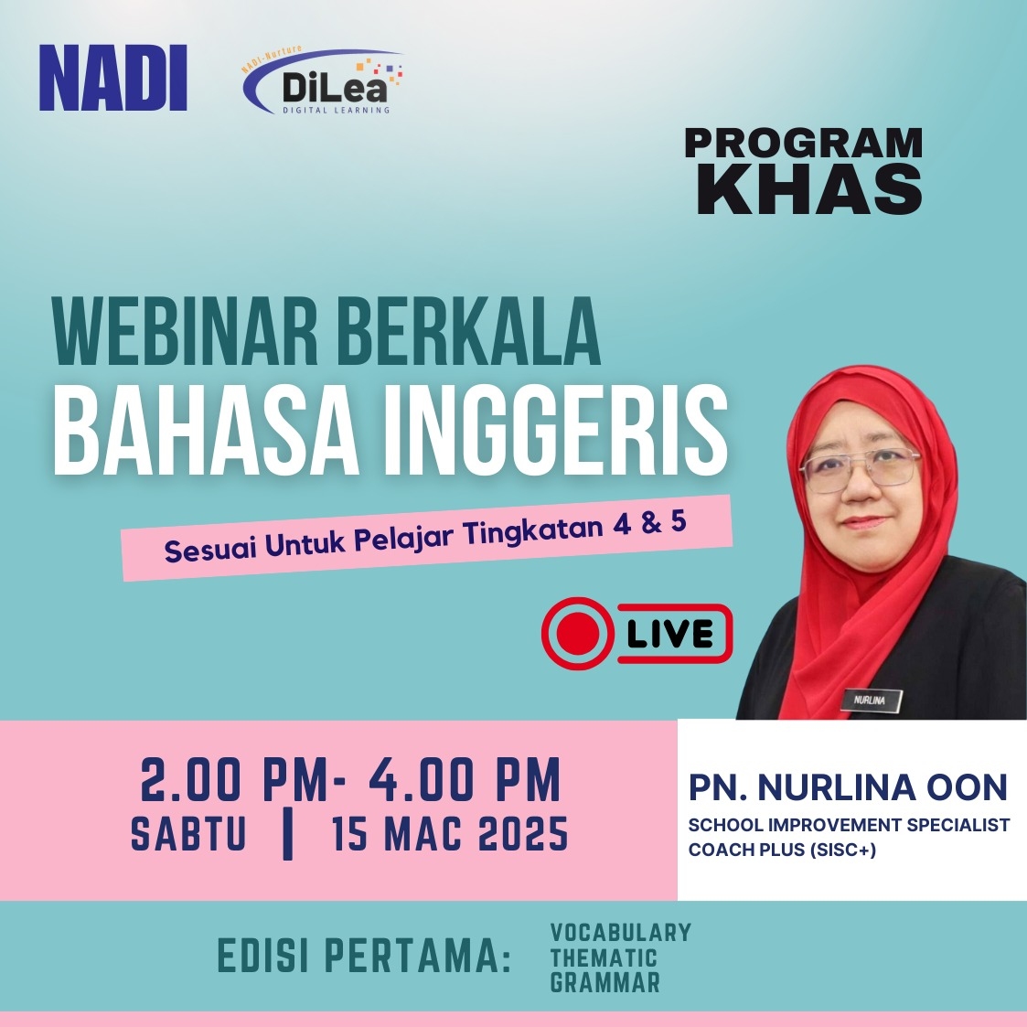 Sukacita dimaklumkan di bawah Elemen Program Khas NADI-Nurture DiLea, Webinar Berkala Bahasa Inggeris Edisi 1 akan diadakan pada 15 Mac 2025 (Sabtu). Program Khas ini terbuka kepada pelajar Tingkatan 4 dan 5.